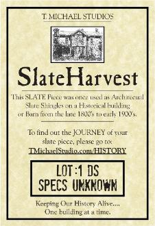 | Your slate piece was used as Architectural Roofing Shingles for an 1800's -1900's STRUCTURE. The slate is from a combination of our other 4 buildings. (Please see history of other Structures for their History.) No other information is available. |