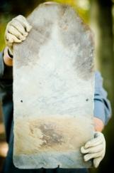 | Each piece of slate is very unique & special. The slate I use has been Reclaimed from Historical buildings and barns throughout the heartland and was used as Architectural Shingles . Every piece that leaves my studio has a history of its own, and a journey that it has taken. Once I receive it, I sculpt it and mold it into a new form for someone who now will use it to enhance their life and create a new history with their family. |